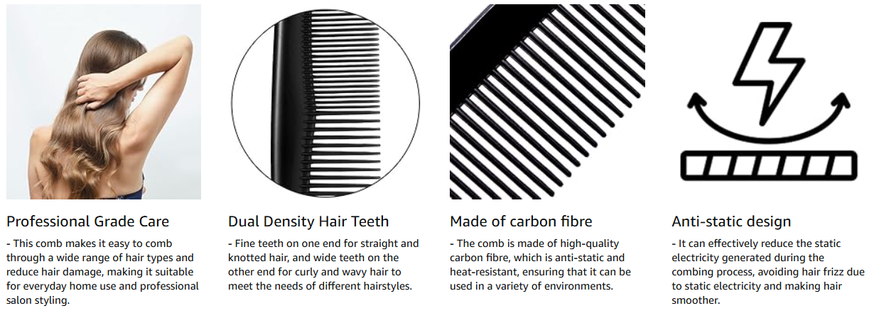 These combs are made from sturdy carbon fiber material, ensuring their durability. They are built to withstand regular use without easily breaking or bending. This reliability makes them a long-lasting investment for your hair care collection.